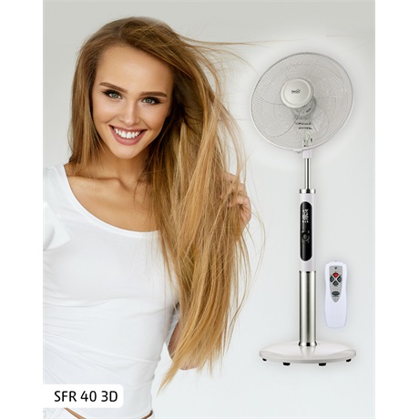 Az SFR 40 3D Álló ventilátor állítható vízszintes, függőleges vagy akár 3D oszcillálásra, így képes a helyiség teljes területén a levegő átmozgatására. A 3 fokozatban szabályozható ventilátor teljesítmény mellett normál, természetes vagy alvó üzemmód választható. A 12 órás kikapcsolás időzítő kényelmes használatot biztosít. Az álló ventilátor magassága 115- 130 cm között alakítható.